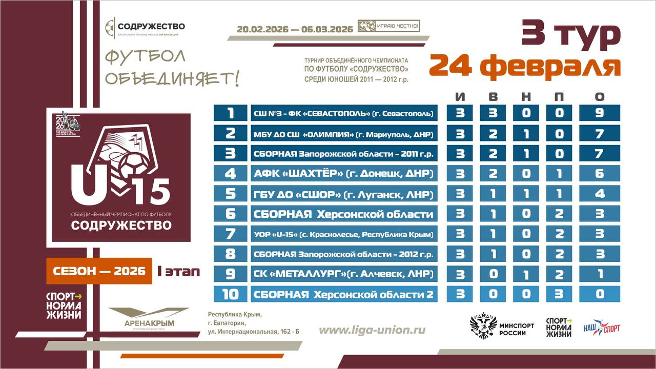 Турнирная таблица после 3 тура I этапа турнира Объединённого чемпионата по футболу «Содружество» среди юношей 2011-2012 годов рождения (U15)